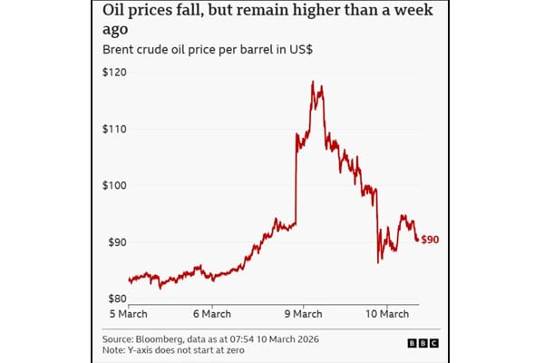 البتہ آج خام تیل کی قیمت تقریباً نوے ڈالر فی بیرل تک گرگئی ہے تاہم جنگ کی غیریقینی صورت حال کے باعث اب بھی خام تیل کی قیمتوں سے متعلق خدشات برقرار ہیں اور اتار چڑھاؤ دیکھا جا رہا ہے۔