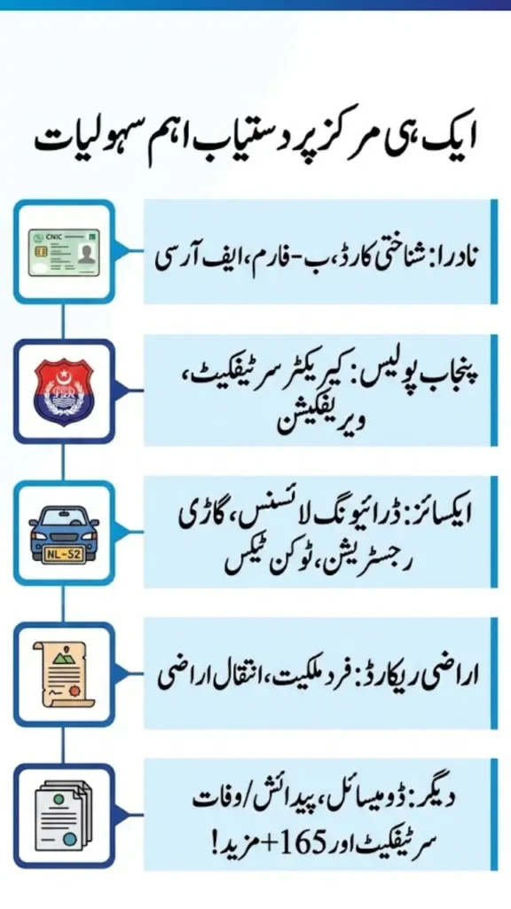 The biggest problem faced by the people of Punjab was that for every small or big government service — like getting a domicile certificate, B-Form, character certificate from Punjab Police, driving license renewal, land record (fard), CNIC renewal/duplicate, vehicle registration, token tax, or any NADRA/Exise-related service — you had to run from one department to another.