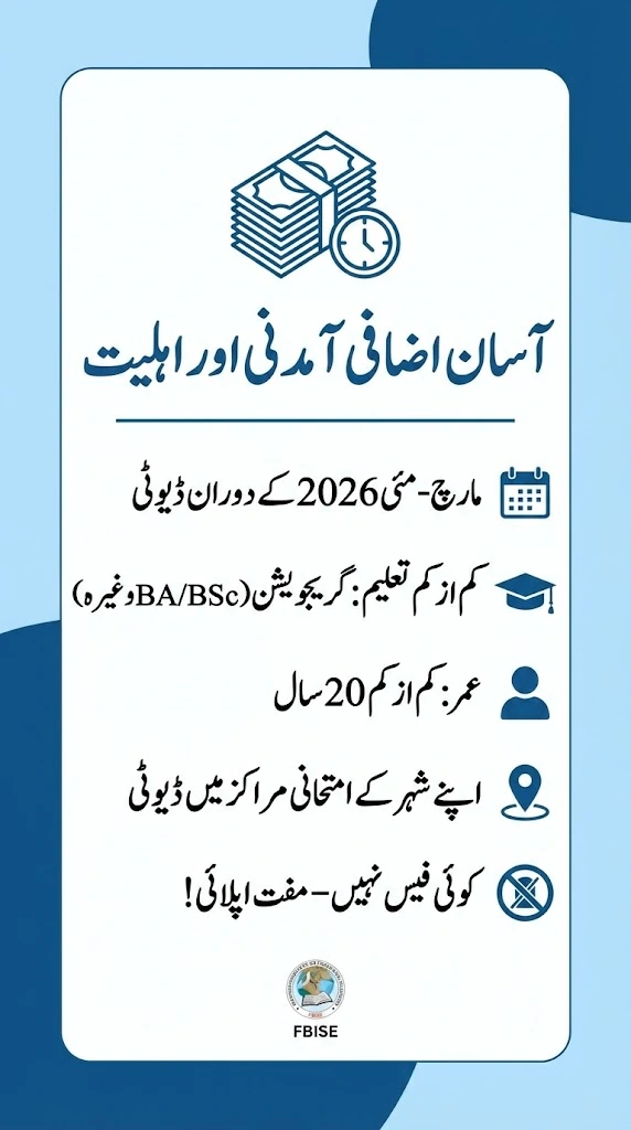 - Easy extra income during March-May 2026 (payment per duty day as per board rules – often PKR 1,000–2,000+ per day, total can be 30k–60k depending on days).