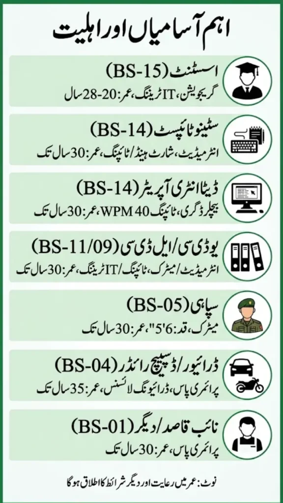Posts include Assistant (BS-15), Stenotypist (BS-14), Data Entry Operator (BS-14), UDC (BS-11), LDC (BS-09), Sepoy (BS-05), Driver (BS-04), Dispatch Rider (BS-04), Naib Qasid (BS-01), Chowkidar (BS-01), Notice Server (BS-01) and more.