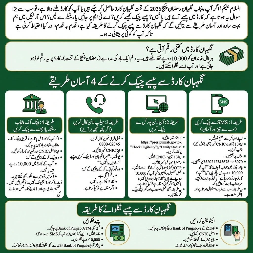 Agar aap Punjab Nigehban Ramzan Package 2026 ke tehat Nigehban Card hasil kar chuke hain ya aap ko card milne wala hai, to sab se bara sawal hota hai: card mein paisay aaye hain ya nahi? Paisay check kaise karein? ATM par jayein ya retailer se lein?